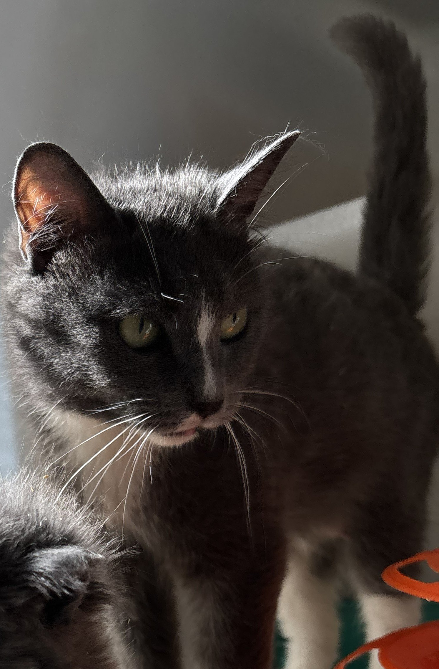 She came to us as a stray with new born kittens who have grown and flown the nest. She then (stole) raised another litter that we were bottle feeding for us.